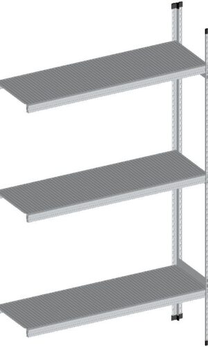 12 014 FtUGP ECO csavarmentes salgó polc kiegészítő egység, 500 kg-os teherbírással, 1450 mm magas oszlopokkal, 400 mm mély és 900 mm széles, 3 db 180 kg teherbírású polcszinttel, horganyzott kivitelben.