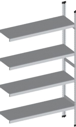 13 349 FtUGP ECO csavarmentes salgó polc kiegészítő egység, 500 kg-os teherbírással, 1450 mm magas oszlopokkal, 320 mm mély és 900 mm széles, 4 db 180 kg teherbírású polcszinttel, horganyzott kivitelben.