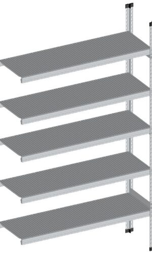17 131 FtUGP ECO csavarmentes salgó polc kiegészítő egység, 500 kg-os teherbírással, 1450 mm magas oszlopokkal, 400 mm mély és 900 mm széles, 5 db 180 kg teherbírású polcszinttel, horganyzott kivitelben.