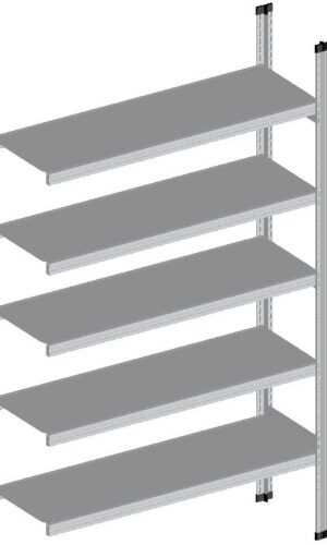 17 131 FtUGP ECO csavarmentes salgó polc kiegészítő egység, 500 kg-os teherbírással, 1450 mm magas oszlopokkal, 400 mm mély és 900 mm széles, 5 db 180 kg teherbírású polcszinttel, horganyzott kivitelben.